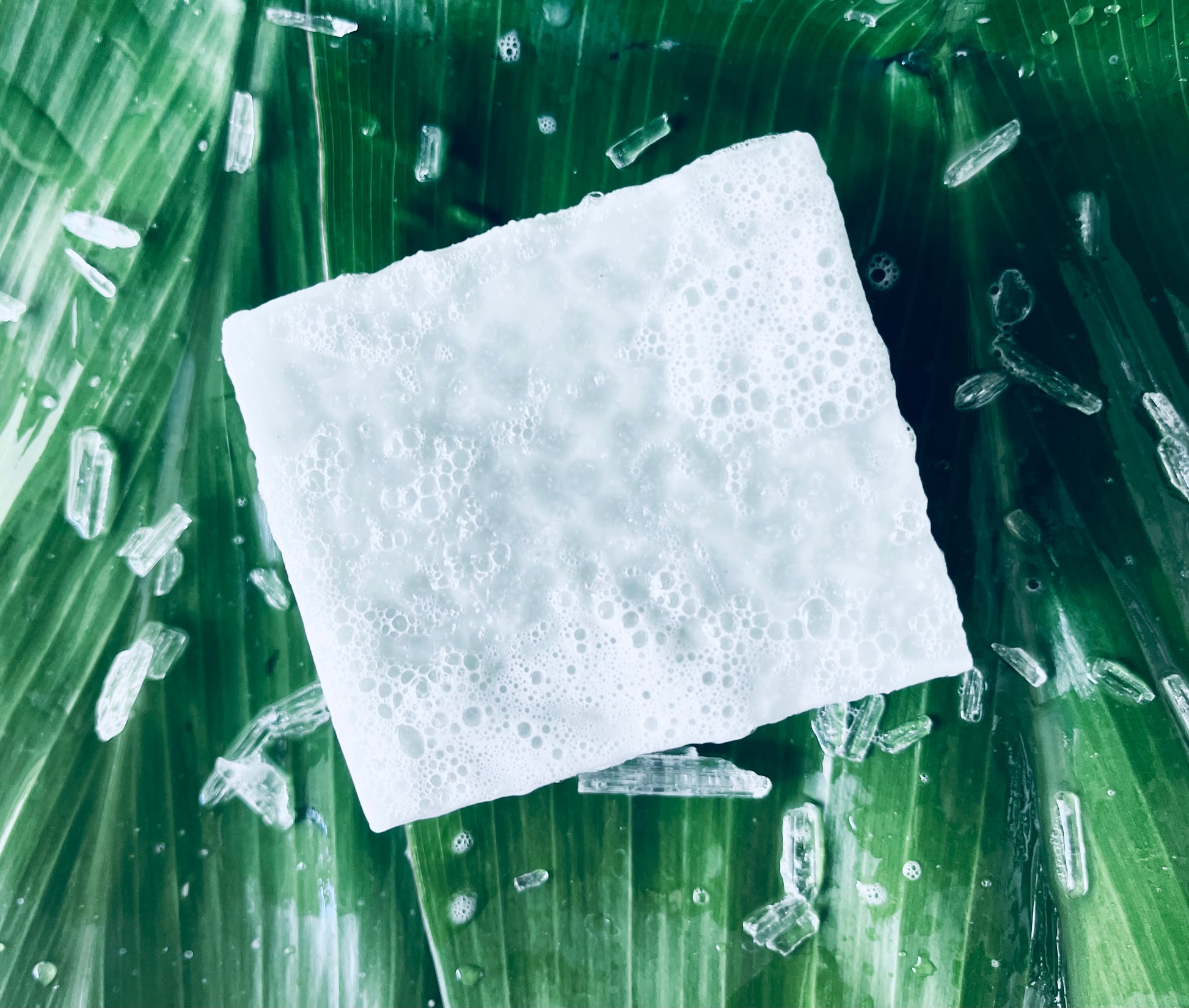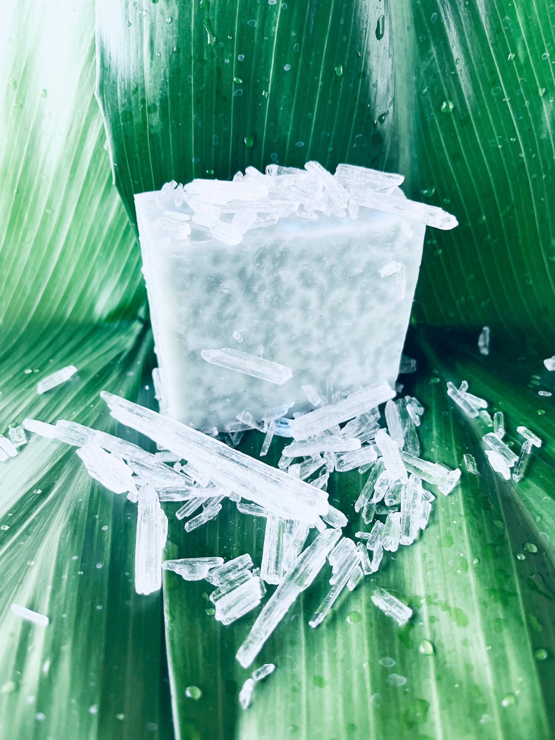 Ingredients: Saponified oils of Maracuja (Passionfruit seed), Andiroba, Papaya seed, Olive, & Coconut. Rose water, Kona Deep Sea Salt (2200 ft Deep), Moringa extract, Tea Tree oil, Ginger tea, Mint extract, Pumice, Blue clay, Menthol crystals, Leaf oils.