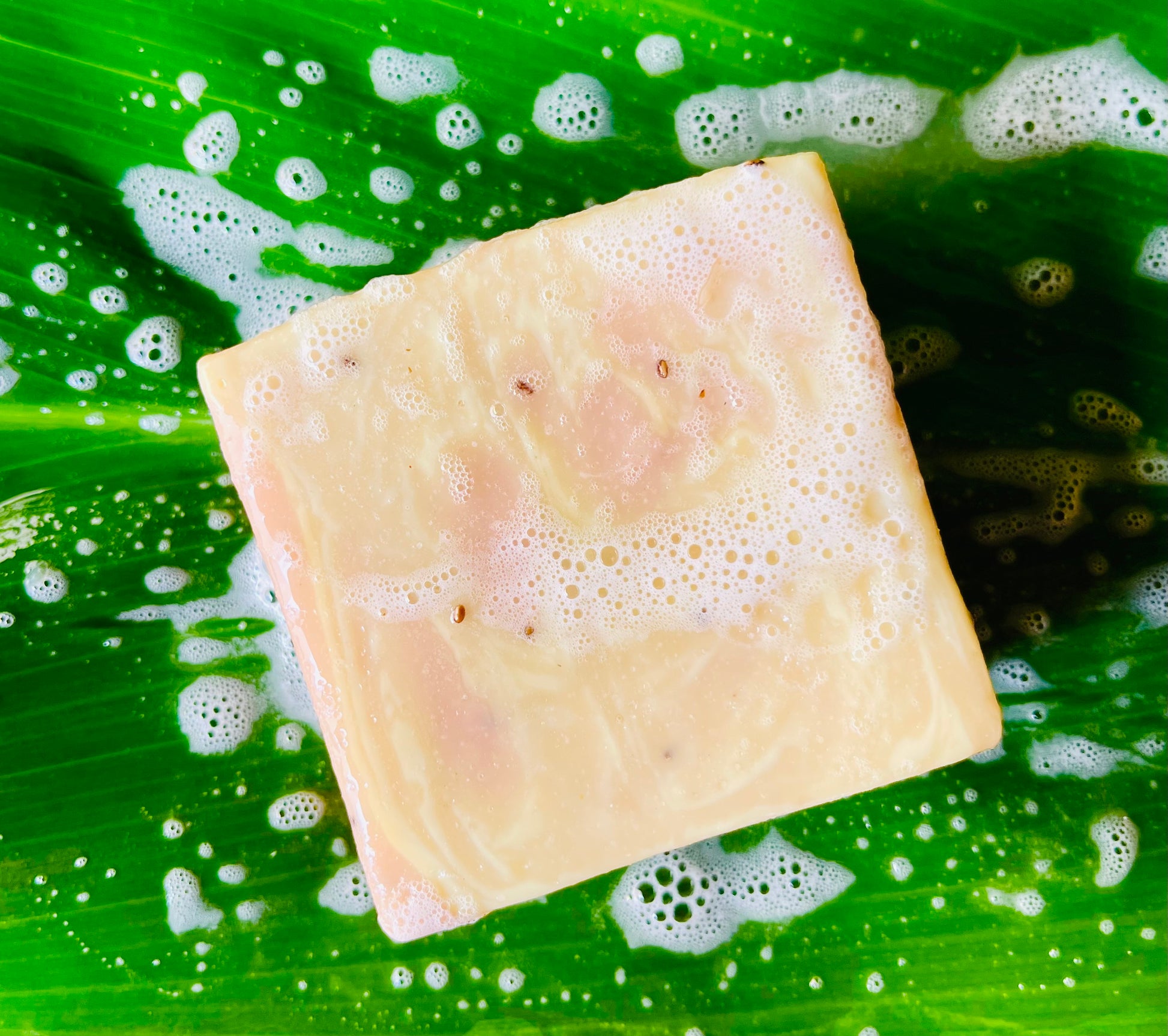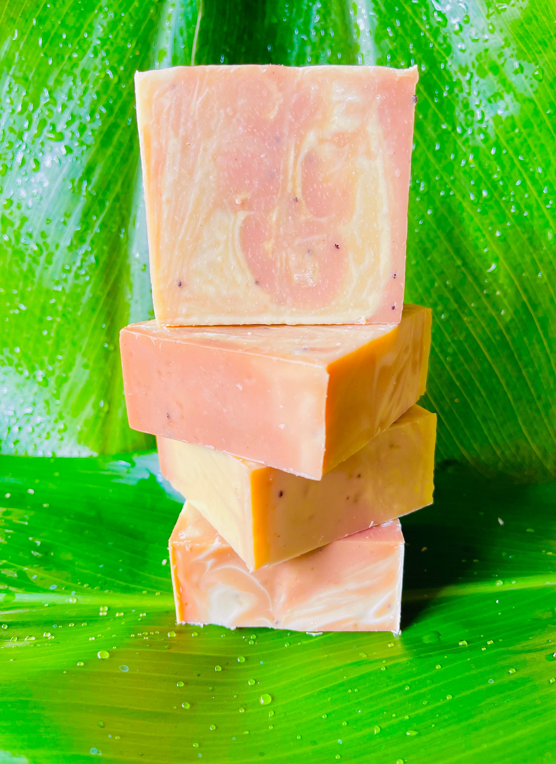 Ingredients: Saponified oils of Coconut, Kukui nut, Macadamia nut, Avocado, Olive, Grapeseed. Maui grown Pineapple (raw), Pineapple juice, Turmeric, Watermelon meat (raw), Soju, Chia seeds, Pumice, Aloe, Donkey’s milk, Pink clay, Yellow clay, Leaf oils.